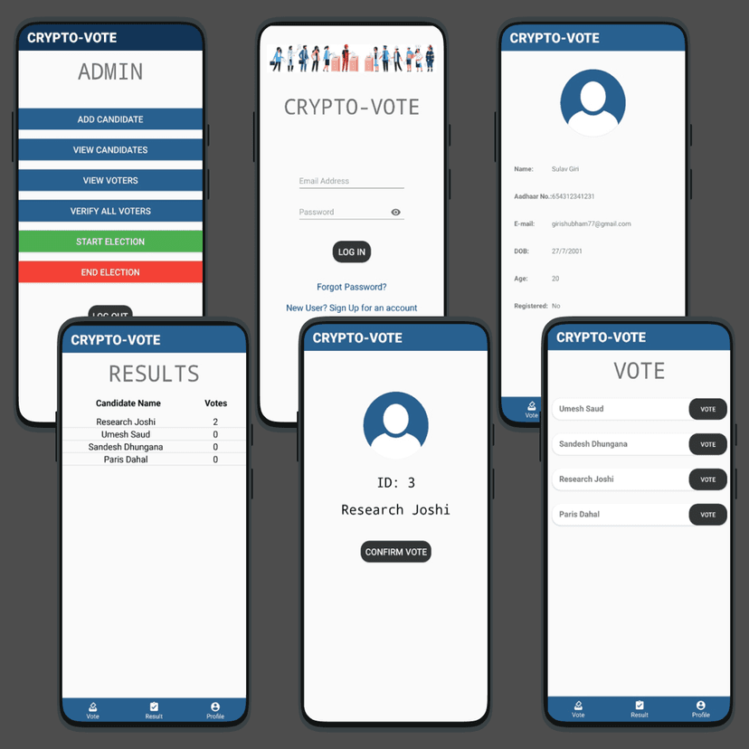 Cryptovote is an android application designed for decentralized voting that runs on a Virtual Ethereum Network (EVN). The main application was designed using Core Java and the blockchain functionalities were embedded with the use of Solidity.