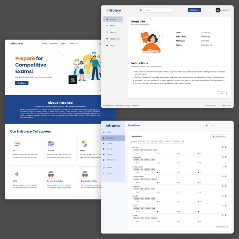Intrance is an online competitive entrance preparation platform for different examinations where the student can take part in weekly competitive examinations. The platform provides: